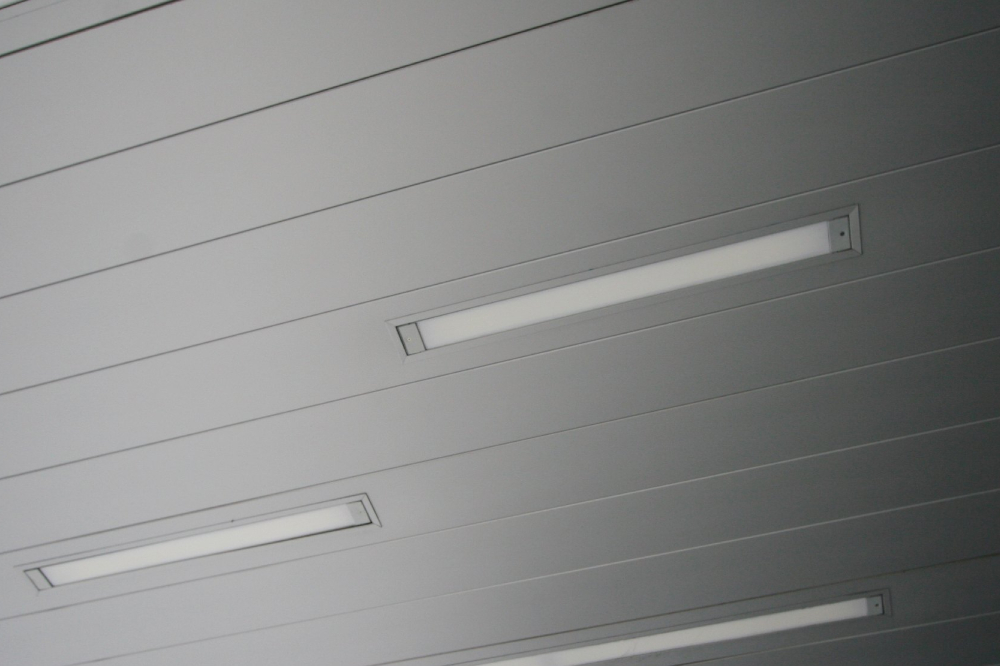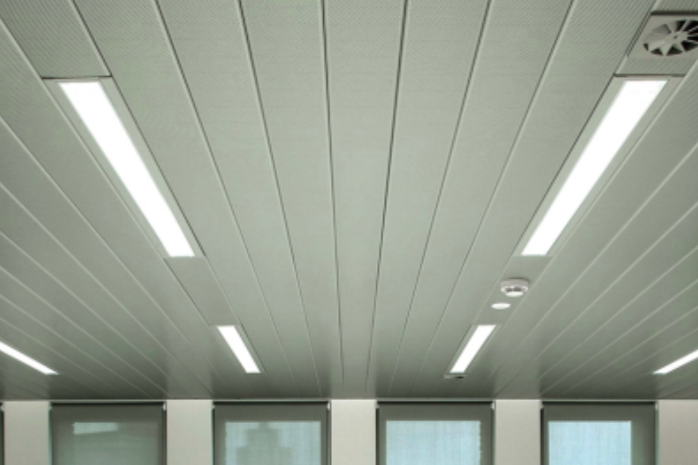 The Metafino 300 C Ceiling System features 300mm wide x 30mm panels made from roll-formed 0.5mm or 0.7mm thick aluminum sheets or 0.5mm thick coil-coated galvanized steel sheets with beveled edges. The panels can be up to 5 meters in length and are pre-coated with 20-micron polyester paint on the front side and a 5-8 micron primer coat on the back side. Powder-coated panels come with 60-micron polyester paint on the front side only. These panels are clipped onto powder-coated G.I. carriers measuring 41.5mm wide x 62mm deep x 0.5mm thick, with cutouts to hold the panels in a 300mm module. The carriers, available in standard lengths of up to 5 meters, are spaced at 1.2 meters and suspended using 4mm diameter G.I. suspension rods and stainless steel suspension spring clips. G.I. edge profiles or wall angles measuring 24mm x 24mm x 0.35mm thick are installed on walls to match the ceiling system.