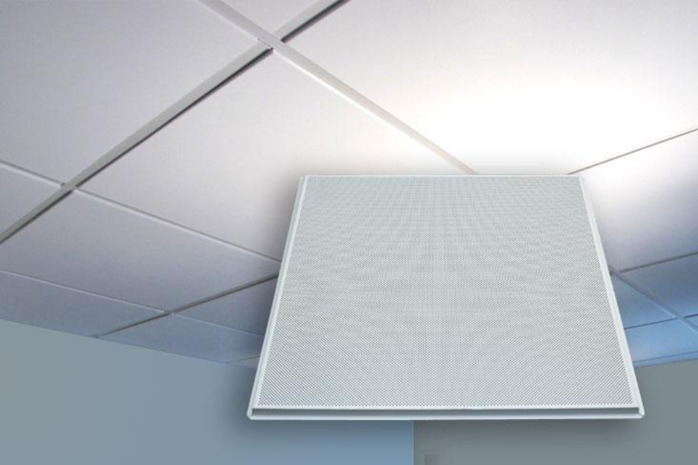 The Metafino Lay-in false ceiling system features steel or aluminum tiles measuring 595 mm x 595 mm. These tiles are manufactured from 0.50 mm thick polyester coil-coated galvanized steel with a 120 gsm zinc coating or 0.7 mm aluminum powder-coated with 60 microns polyester paint in AA5050, AA3105, or AA1050 aluminum alloys. Available with square or beveled edges, the coil-coated steel tiles have a 20-micron polyester-coated finish on the front and an 8-micron alkyd primer coating on the back.