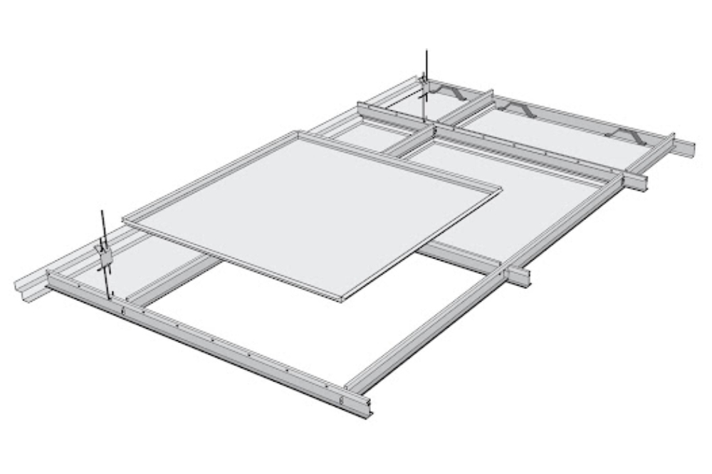 The exposed metal grid system includes main runners and cross tees, roll-formed from galvanized steel with a 120 gsm zinc coating. The main and cross tees, equipped with bayonet couplings for quick installation, have heights of 32/38 mm and 26 mm, respectively. The grid is suspended from the roof using G.I. wire rods and suspension hangers, spaced at a maximum of 1200 mm, and filled with 1200 mm or 600 mm cross tees. The hangers are fixed to the roof with expansion fasteners, while wall angles, measuring 24 mm x 24 mm x 0.4 mm, are made of coil-coated steel to match the tile color.