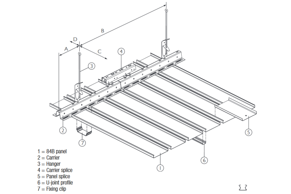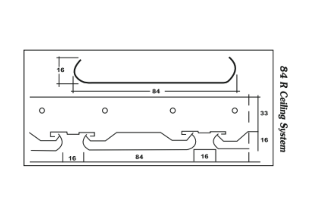 The 84R Linear Ceiling System consists of 84mm x 16mm panels designed without a flush profile for a 100mm module, roll-formed from metal coils. These panels are securely fixed onto roll-formed carriers measuring 32mm wide x 39mm deep, made from 0.9mm aluminum or 0.5mm galvanized steel sheets, with cutouts to hold panels in a 100mm module. The system allows a maximum carrier spacing of 1.5m without insulation and 1.2m with insulation.